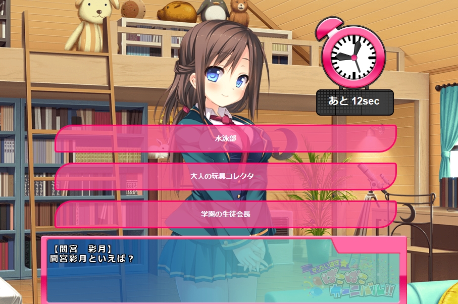 クイズは1問15秒3択で各キャラ固定ですが選択肢は毎回場所が変更されます(問題の順番は固定)